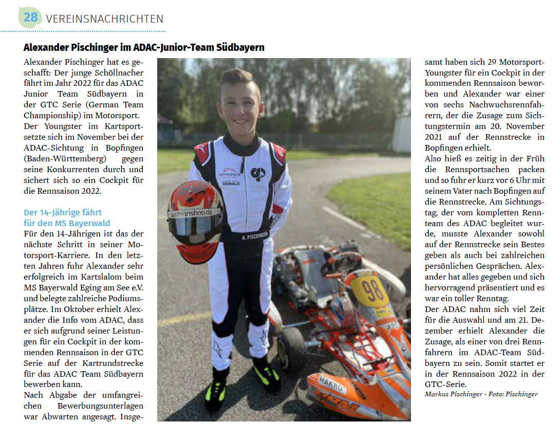 Das Schöllnacher Lindenblatt berichtet über die Aufnahme in das ADAC Jungendförderprogramm in der Ausgabe 01/2022
