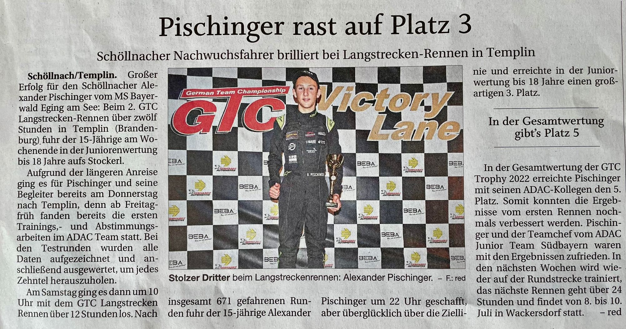 Die Passauer Neue Presse berichtet über den 3. Platz in der Juniorwertung beim 12h GTC Langstrecken Rennen am 11.06.2022 in Templin (Brandenburg)