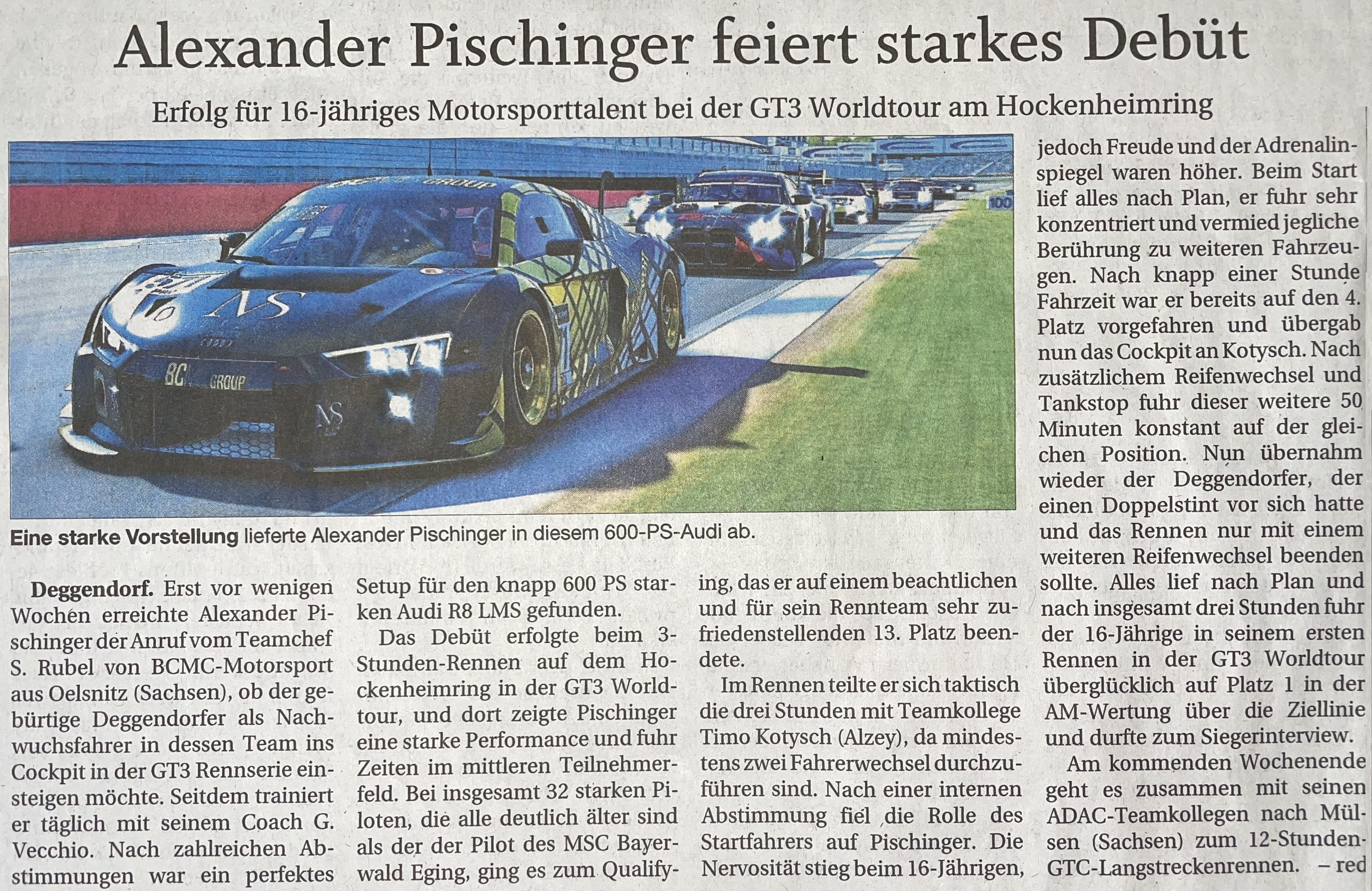 Die Passauer Neue Presse berichtet über mein Debüt bei der SRC GT3 Worldtour am Hockenheimring 05.05.2023