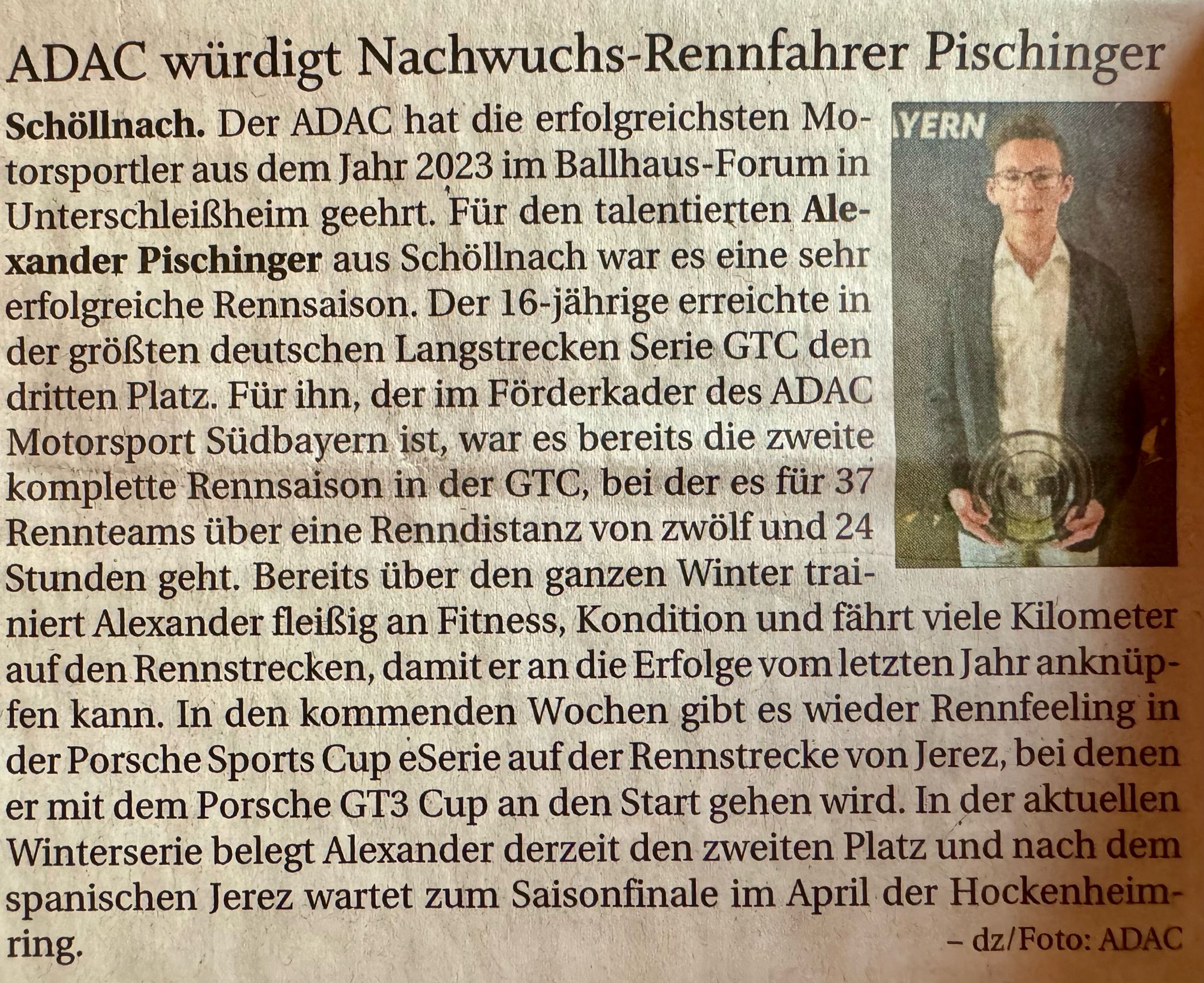Die Passauer Neue Presse berichtet über die ADAC Sportlerehrung im Ballhaus Forum Unterschleißheim am 28.02.2024