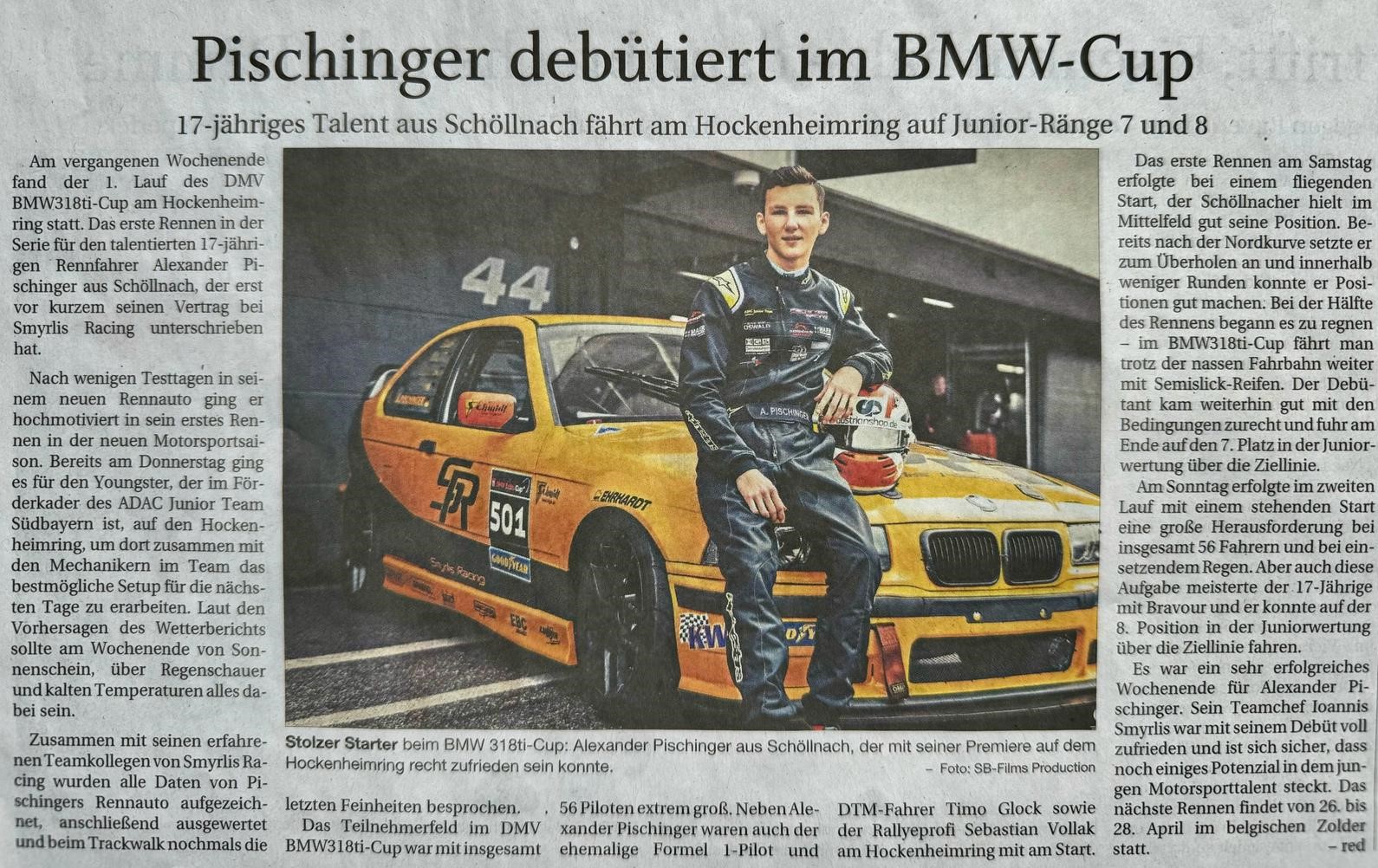 Die Passauer Neue Presse berichtet am 21.03.2024 über mein Debüt im Cockpit von Smyrlis Racing beim BMW318ti Cup am Hockenheimring