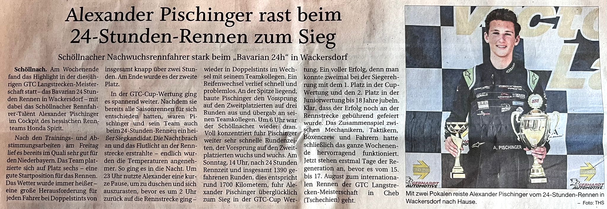 Die Passauer Neue Presse berichtet über Doppelpodium beim 24h GTC Bavarian Race Weekend in Wackersdorf (Bayern) am 20.07.2025